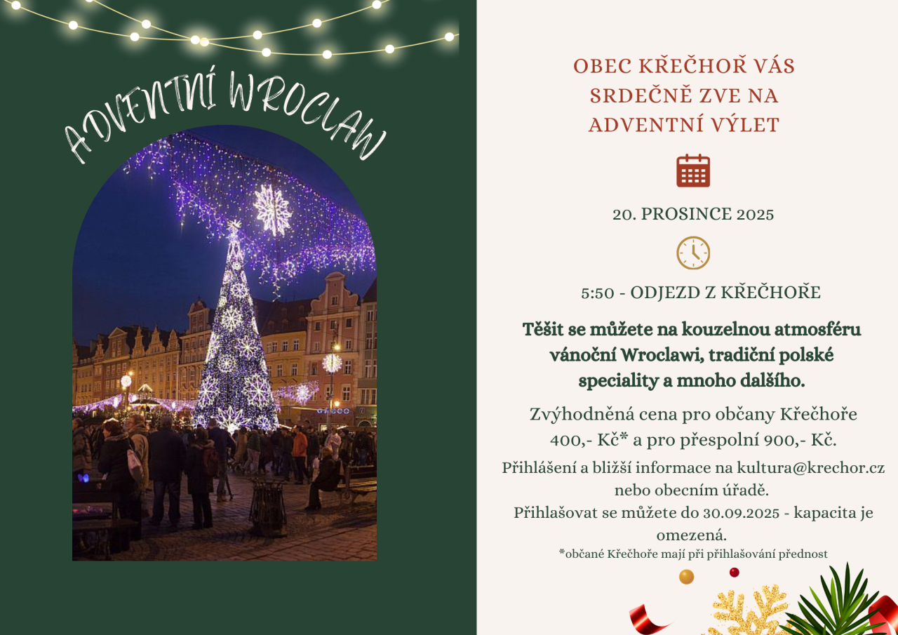 Vydejte se s námi za kouzlem vánočních trhů do malebné Wroclawi! Čeká vás procházka historickým centrem, ochutnávky vánočních dobrot, svařeného vína a nezapomenutelná atmosféra adventu. Přihlašování na OÚ do konce září, kapacita omezena.